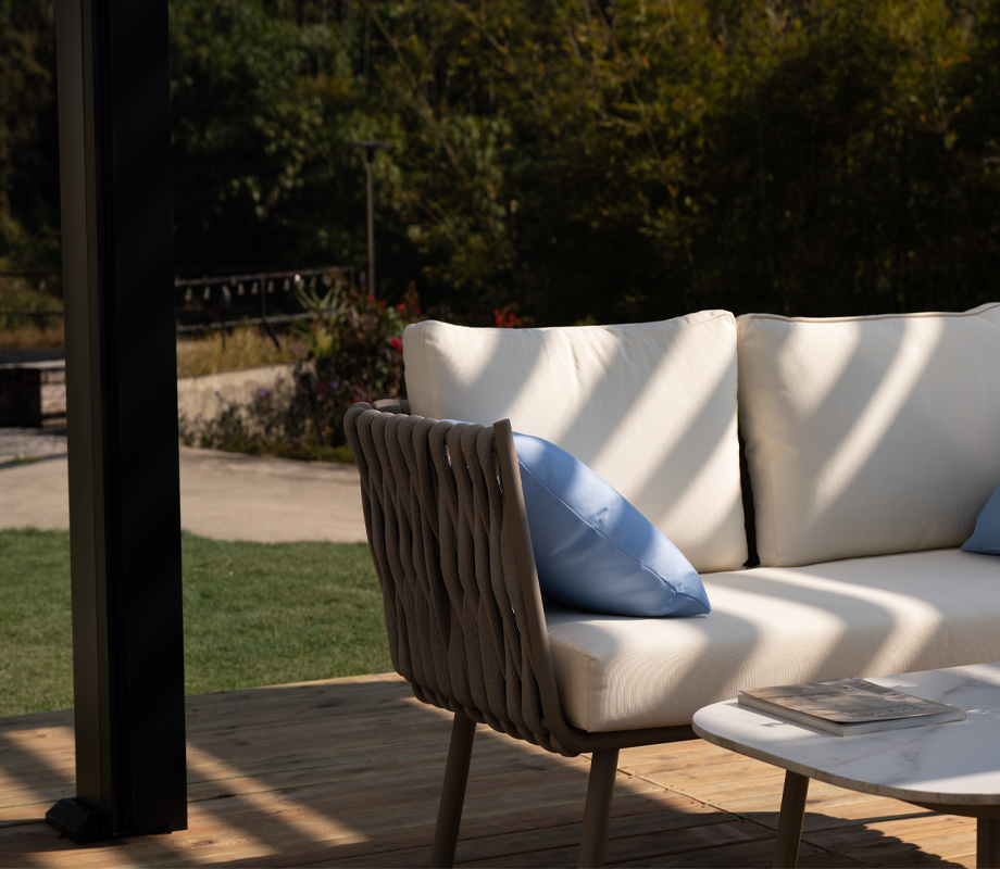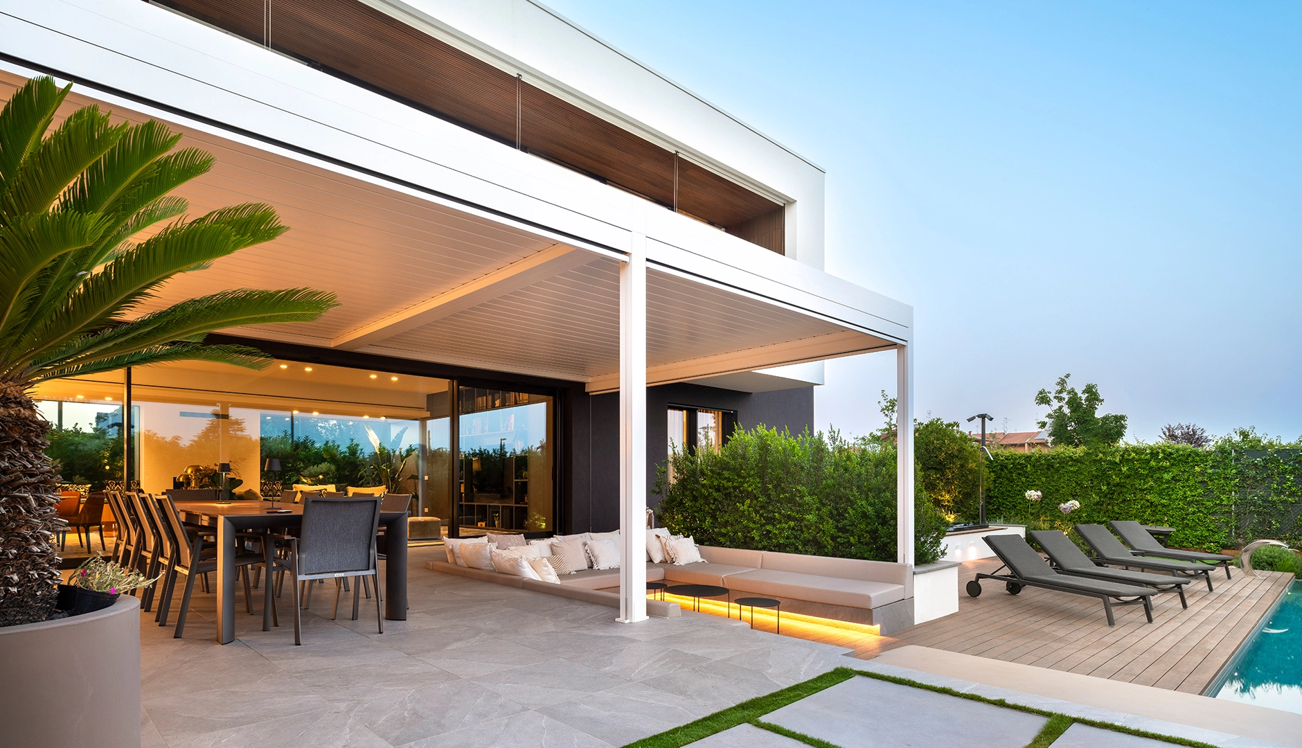 From sunrise to sunset, you can enjoy natural light by always choosing the best angle. This is the superior comfort experience created by Carrera P, the first pergola with fixed and movable blades that rise and overlap one another, following the natural movement of the sunrays.