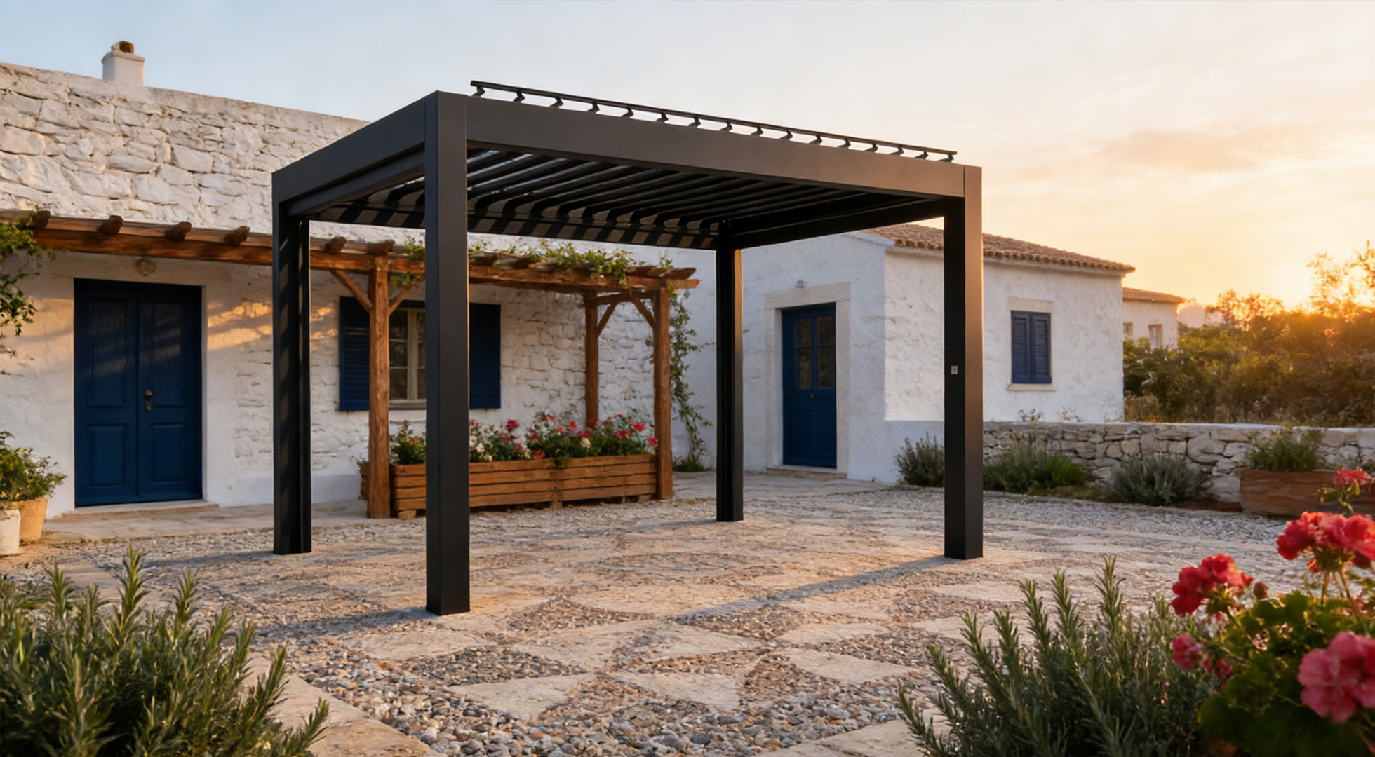Filtered light, natural airflow, and steady comfort shape the space as the day unfolds. Integrated photovoltaic louvers respond to changing weather and operating conditions, quietly generating clean energy to support both the pergola and the home beyond.