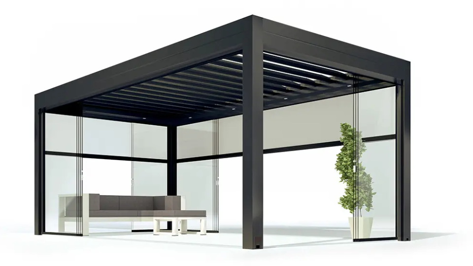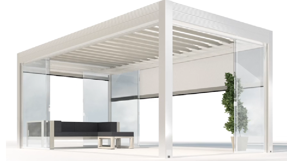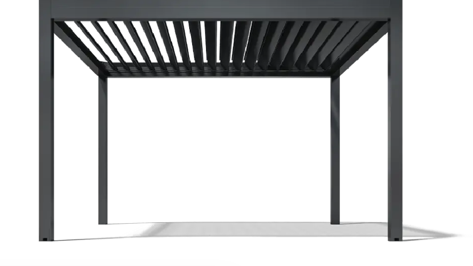 Each louver integrates photovoltaic layers that continuously generate clean energy, turning the roof itself into a functional power source for the pergola and beyond.