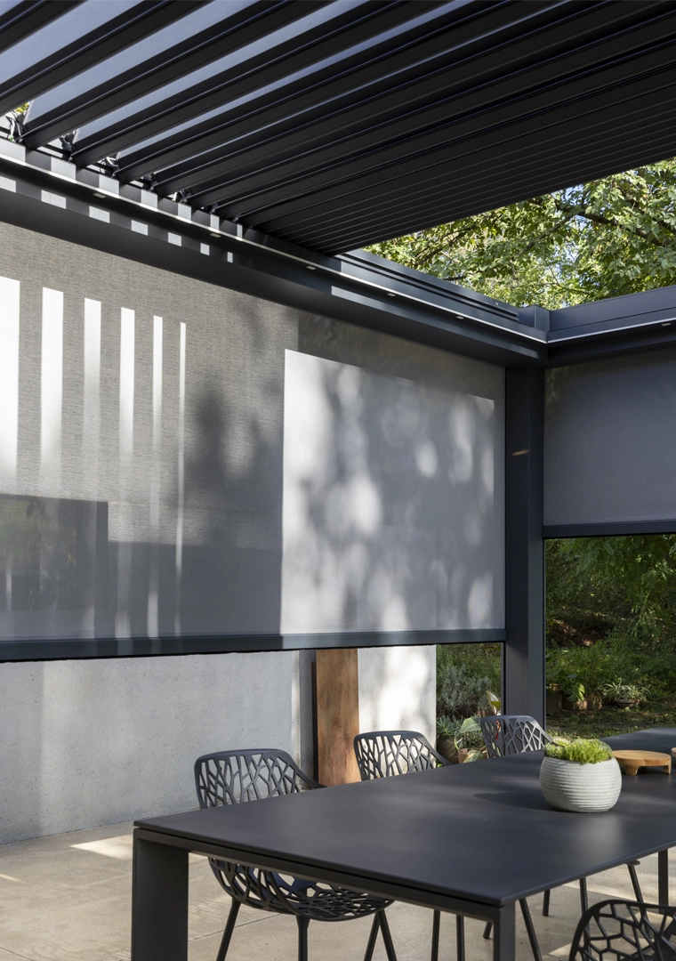 With a single remote, both the louver roof and vertical side screens can be precisely adjusted—controlling light, airflow, and privacy with ease.